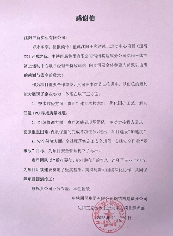 日前,中鐵四局項目部的感謝信跨越金秋而來,字里行間滿是對三新的敬意:“技術(shù)攻堅破局、組織協(xié)調(diào)高效、安全保障扎實,以‘三新力量’為場館如期封閉筑牢根基?!?/span>這紙贊譽背后,是汗水與堅守的沉淀,更是對東北建筑鐵軍匠心與實力的最佳詮釋。