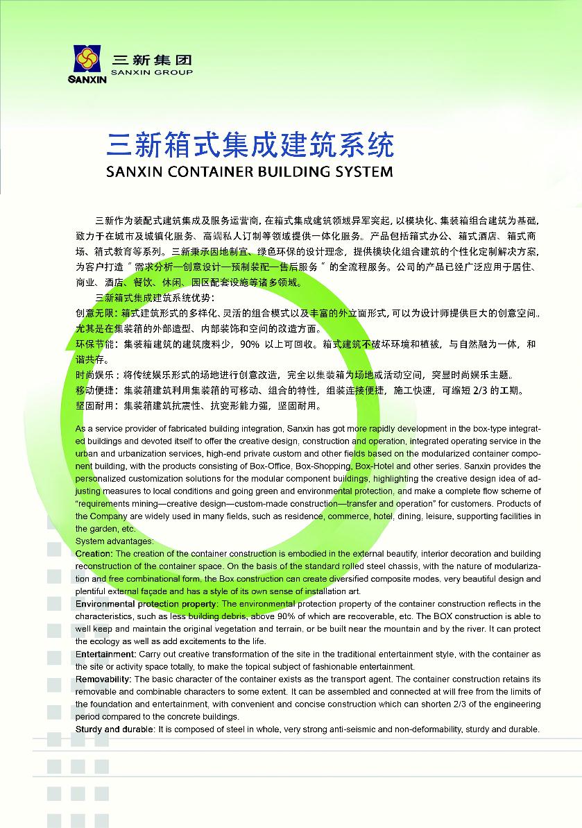 • 三新——綠色建筑領(lǐng)航者。新技術(shù),新工藝,新材料,時(shí)尚,環(huán)保,快捷